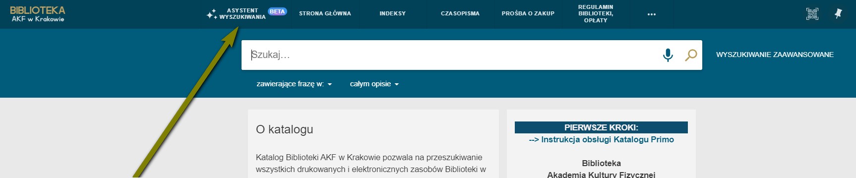 W celu skorzystania z Asystenta Wyszukiwania Primo należy zalogować się do katalogu Biblioteki AKF w Krakowie, a następnie wybrać opcję „Asystent Wyszukiwania” z górnego paska nawigacyjnego.