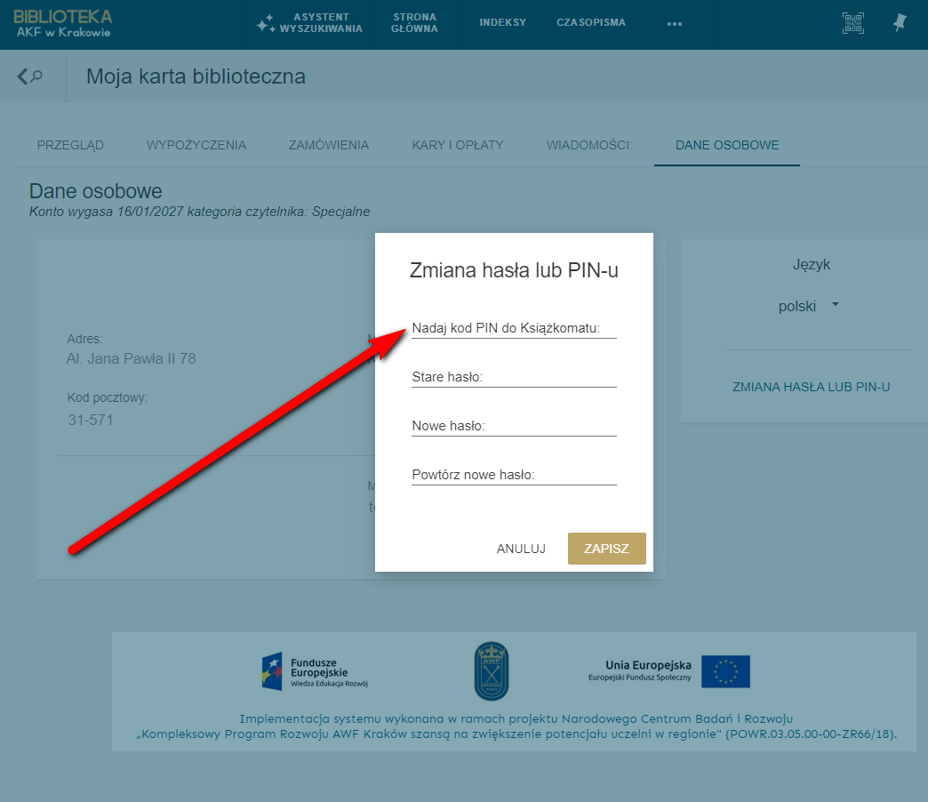 Nadany kod PIN - podobnie jak hasło do konta - można zmienić po zalogowaniu na konto biblioteczne w części „Karta biblioteczna” > „Dane osobowe”.